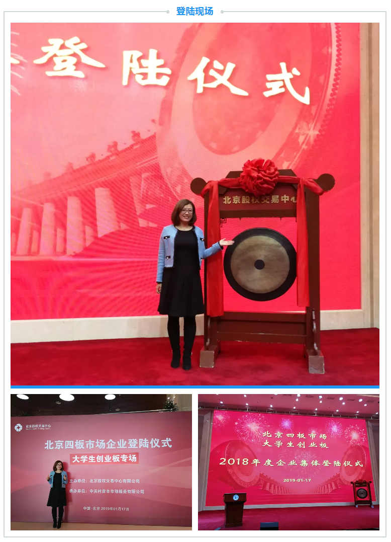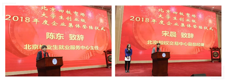 本次集体登陆仪式中,北京市毕业生就业服务中心主任陈东、副主任刘璟卫、培训指导科科长霍东方,北京市人力资源和社会保障局大中专毕业生就业处副调研员陈晓辉,北京工业大学就业创业指导中心就业创业市场办公室主任赵宁,北京林业大学就业指导中心研究员徐博函,北京股权交易中心副总经理宋晨,中关村资本市场服务有限公司副总经理丁志新等领导同志出席。陈东主任、刘璟卫副主任、赵宁主任、宋晨副总经理、徐博函研究员、丁志新副总经理依次为企业授予登陆四板市场大创板牌匾,与企业家们共同敲响了资本市场之锣。
